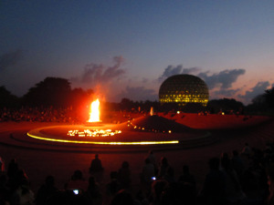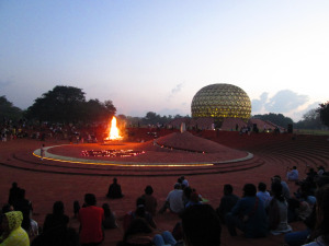 Auroville, an international township near Pondicherry in the southern part of India, celebrates its birthday on the last day of February each year. A bonfire is lit in the amphitheatre next to the Matrimandir. Much before the sun has made its appearance on the horizon and the first bird has sung its mellifluous note, a bluish darkness envelopes the exquisite structure. The leaping flames of the bonfire spread a golden hue all around, as if fighting off the dark forces of nature. Soothing notes play in the background. Soon, all is quiet and a collective concentration starts. Gradually, as the sky starts revealing its azure shade, some wispy clouds float across in a leisurely fashion. Finally, the sun appears on the horizon. The Matrimandir presents itself in all its majestic charm and ethereal beauty.