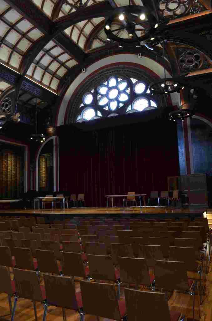A grand staircase, adorned with portraits of various patrons of the college over time gazing benignly at us, led us to the Great Hall which is used for school assemblies and examinations. When Plum was at school, he and others would have eaten in the hall.