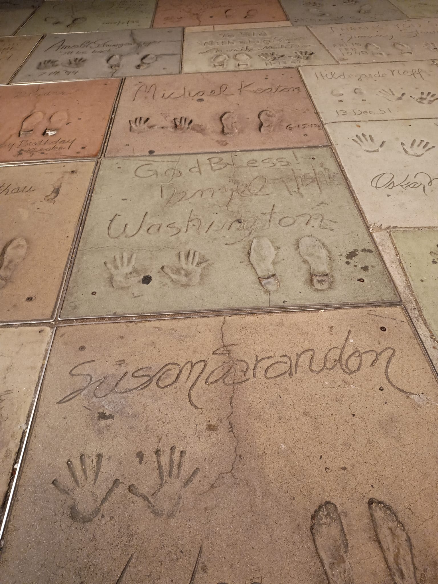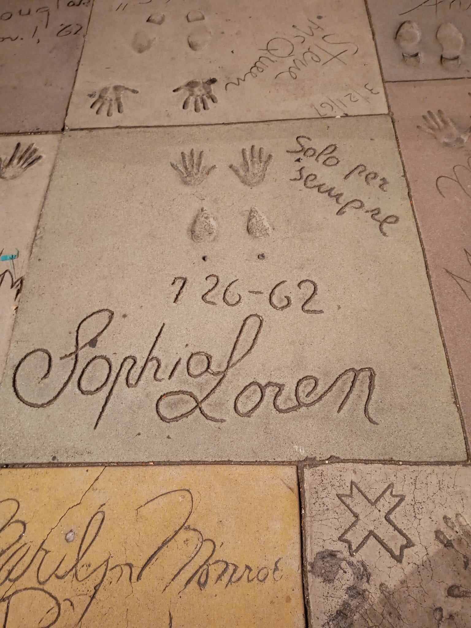 There is also a separate portion next to the Chinese Theatre where concrete slabs carrying either the signatures or the handprints of such yesteryear celebrities as Peter Sellers, Sophia Loren, Marilyn Monroe, Dean Martin, Tom Hanks, Susan Sarandon, and many others can be seen.