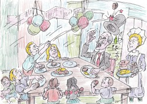 ‘It always seemed to Lord Emsworth that the annual Fête at Blandings Castle reached a peak of repulsiveness when tea was served in the big marquee. It occurred to him that it would be a prudent move to take off his top hat before his little guests appreciated its humorous possibilities, but even as he raised his hand, a rock cake took it off for him.’