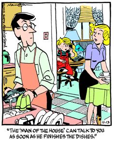 A scene of unalloyed domestic bliss, with the chivalrous husband wearing an apron and pitching in to assist in domestic chores!