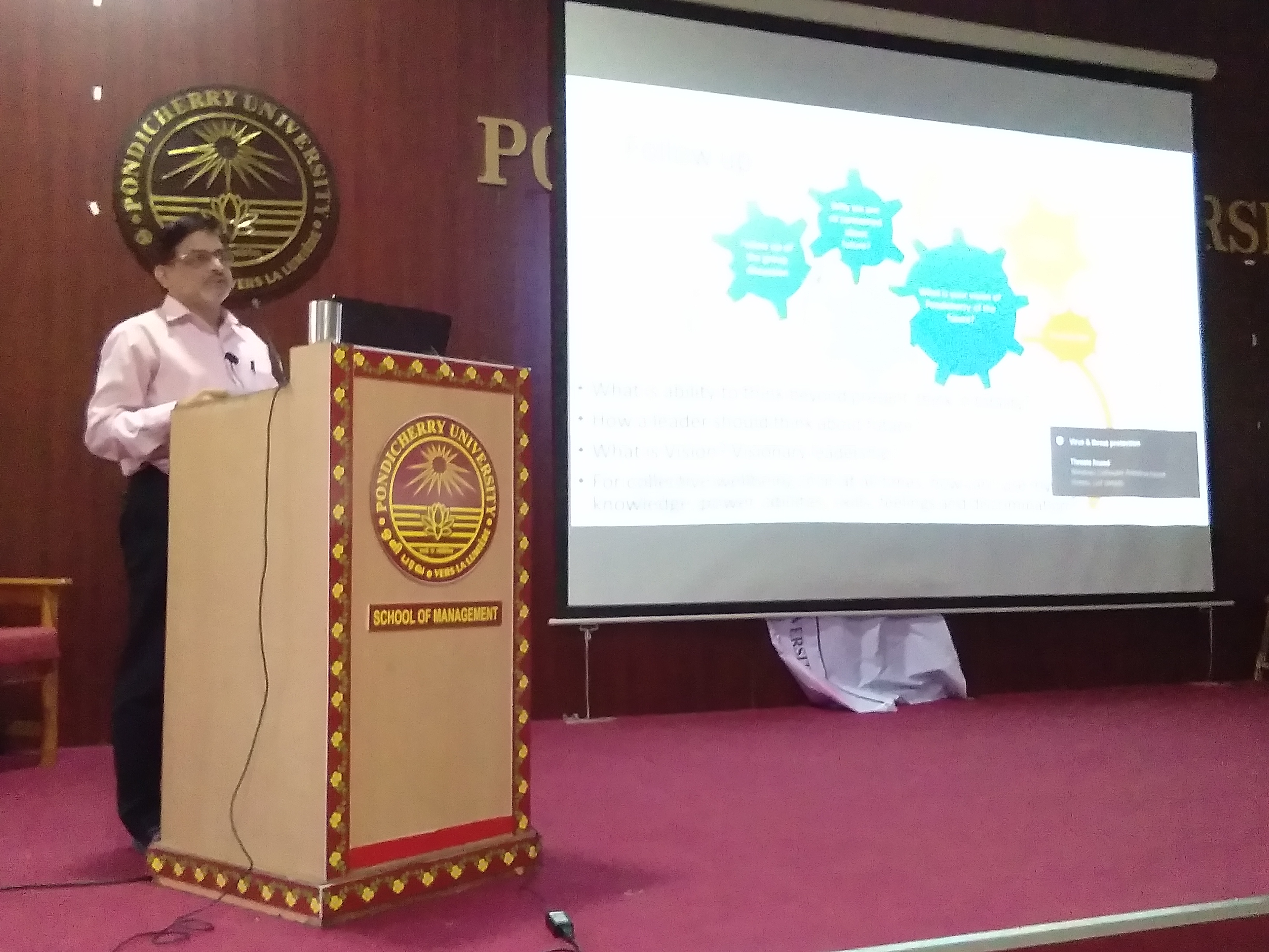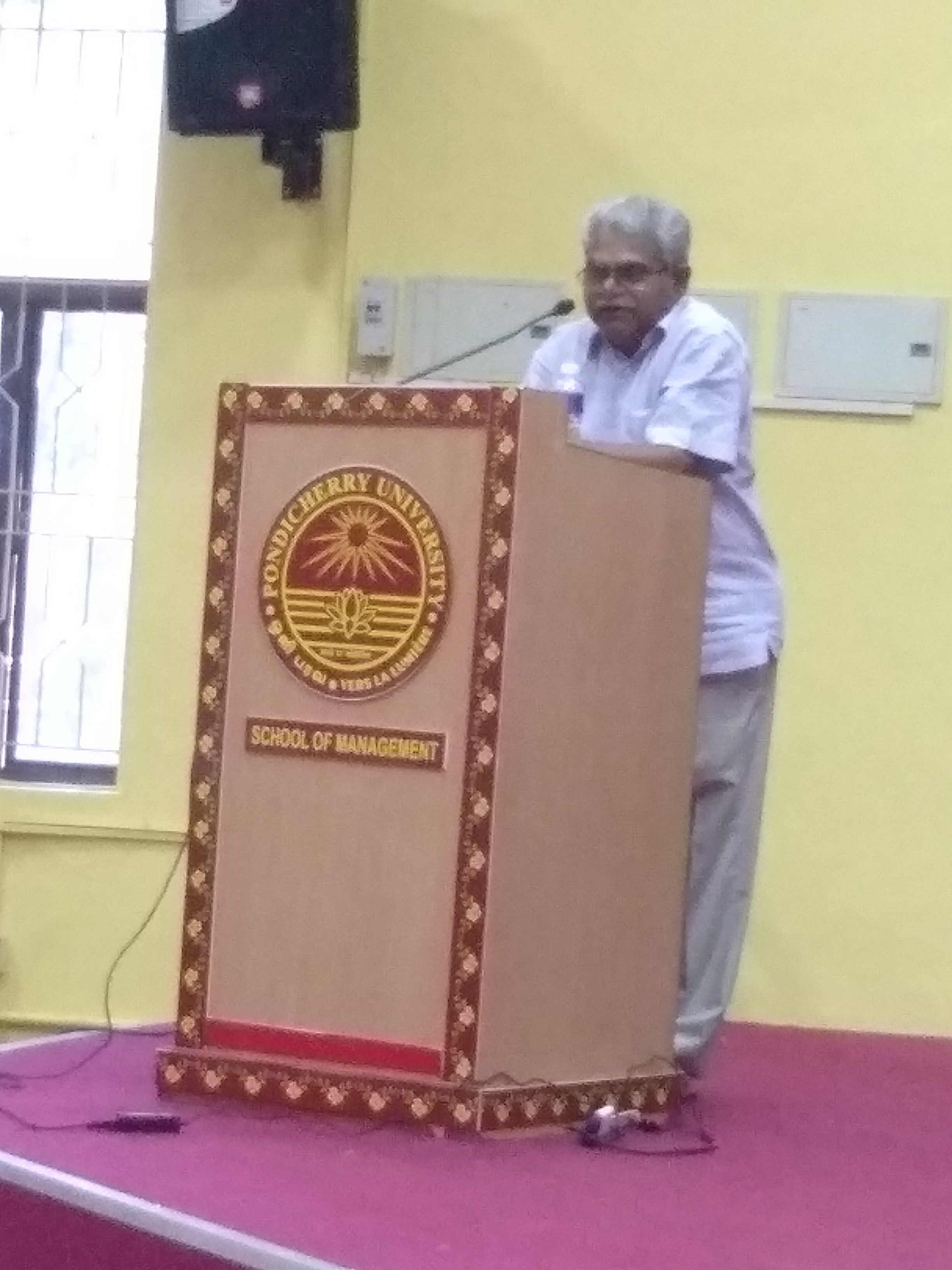 The event was chaired by Dr. G. Anjaneyaswamy, Professor and Dean, School of Management, Pondicherry University. In his concluding remarks, he appreciated the unique contents of the workshop and expressed a hope that the Department of Management Studies may like to have the same incorporated into the formal syllabus of a regular MBA course at Pondicherry University.